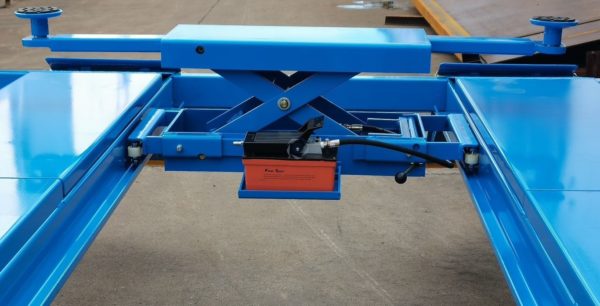 Четырёхточечный подъемник имеет встроенный пневматический стопорный механизм. Разблокировка — рукояткой на управляющей колонне.